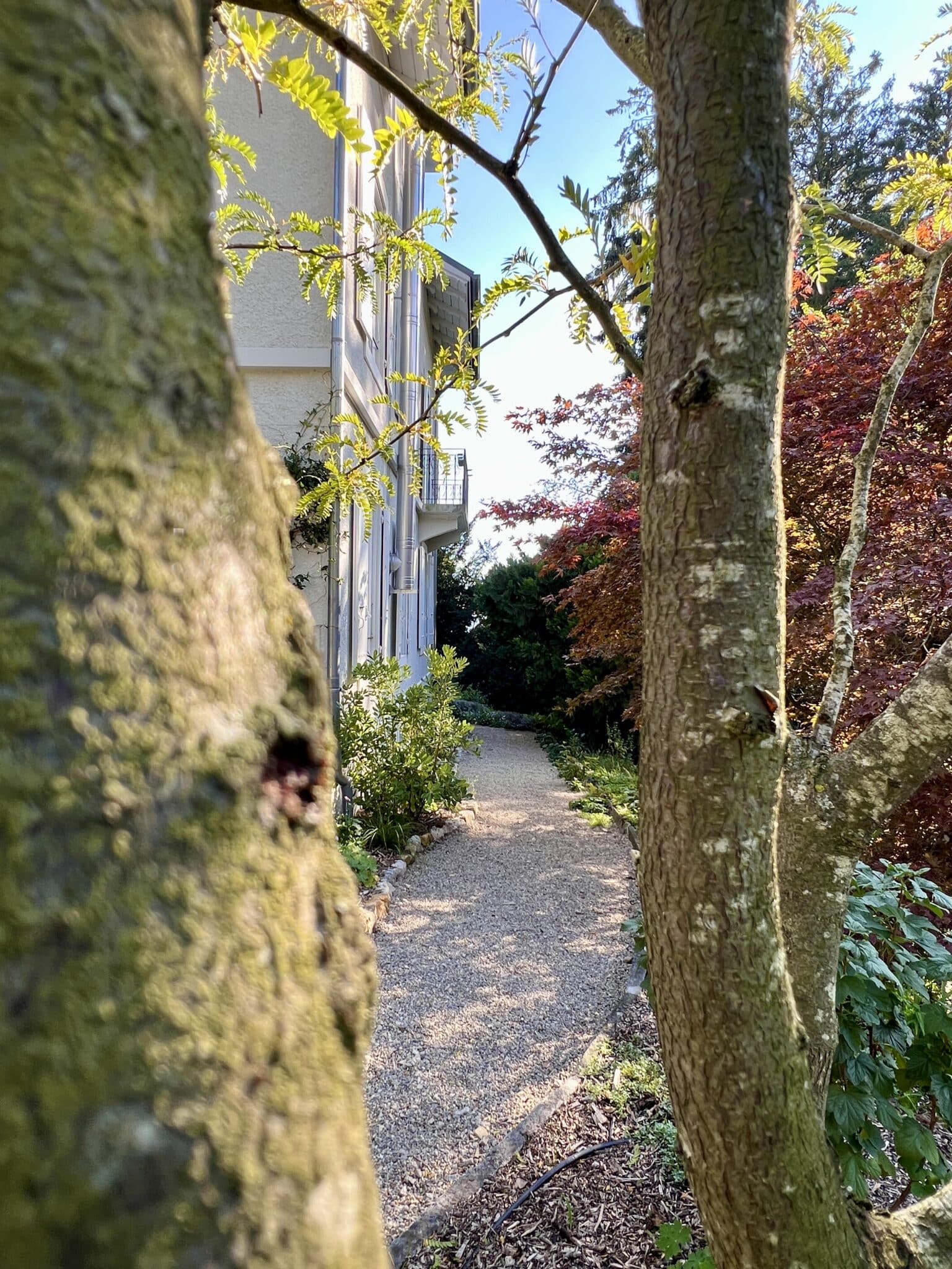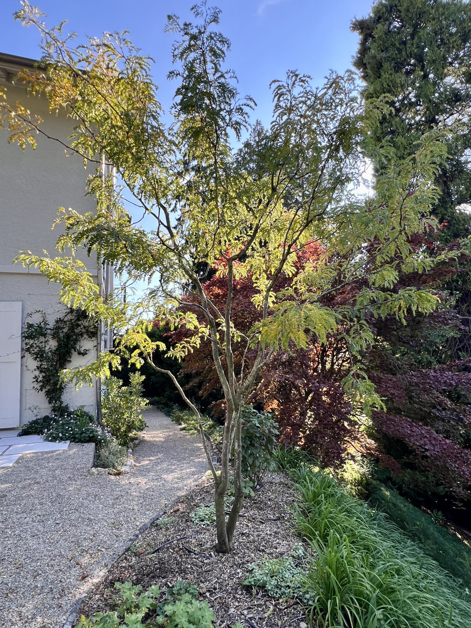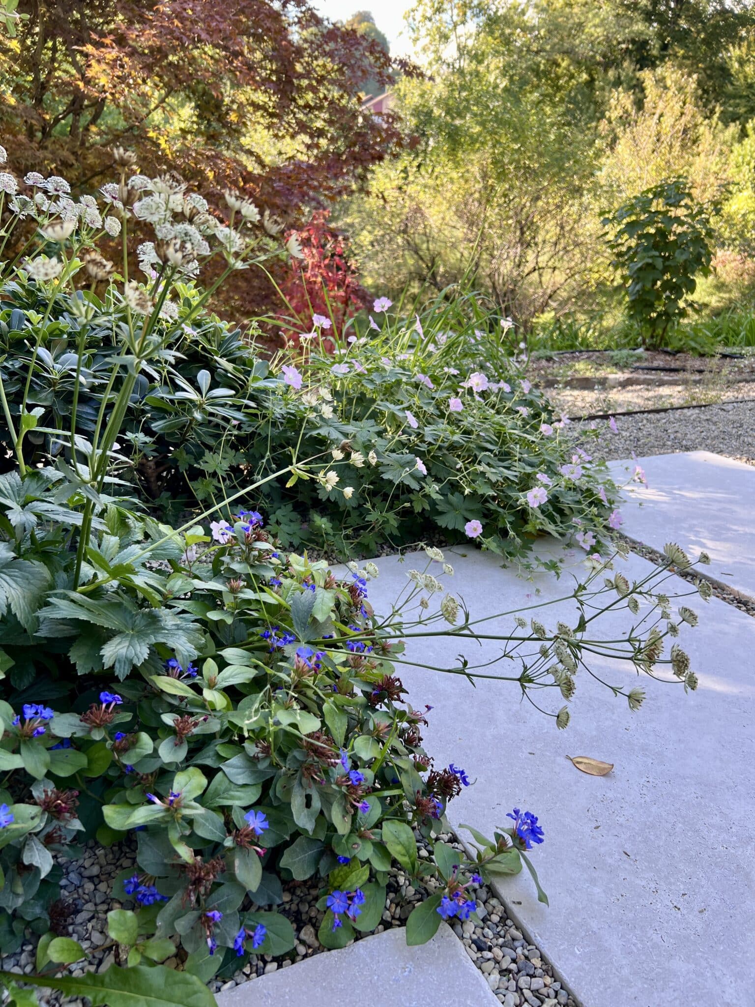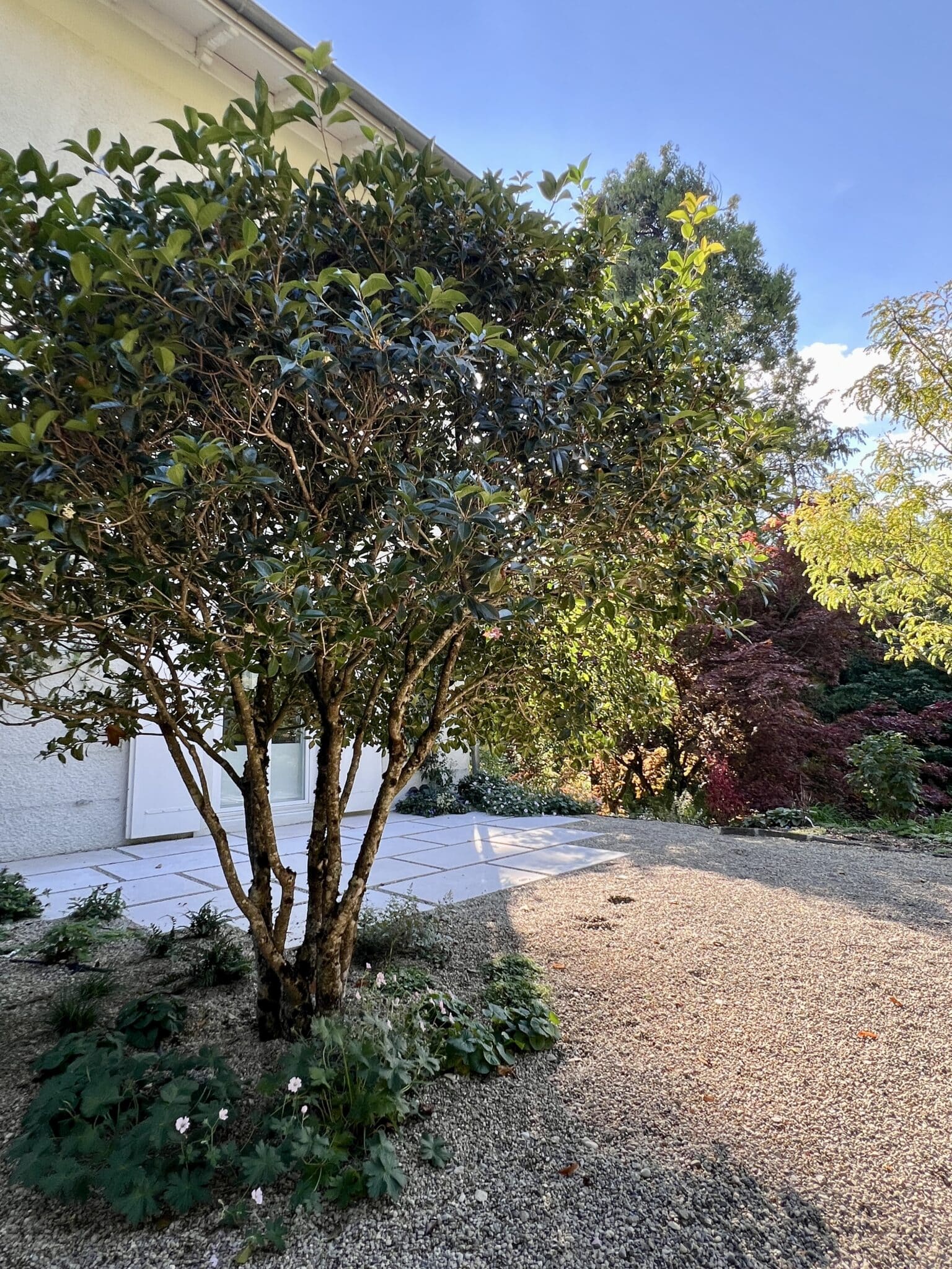 Le cœur du jardin est animé par trois arbres imposants en cépée et en forme parasol : un Acer campestre, un Osmanthus fortunei et un Styrax japonica. Soigneusement choisis en collaboration avec nos clients et Mint Gardens, ils apportent structure, ombrage et caractère au lieu.