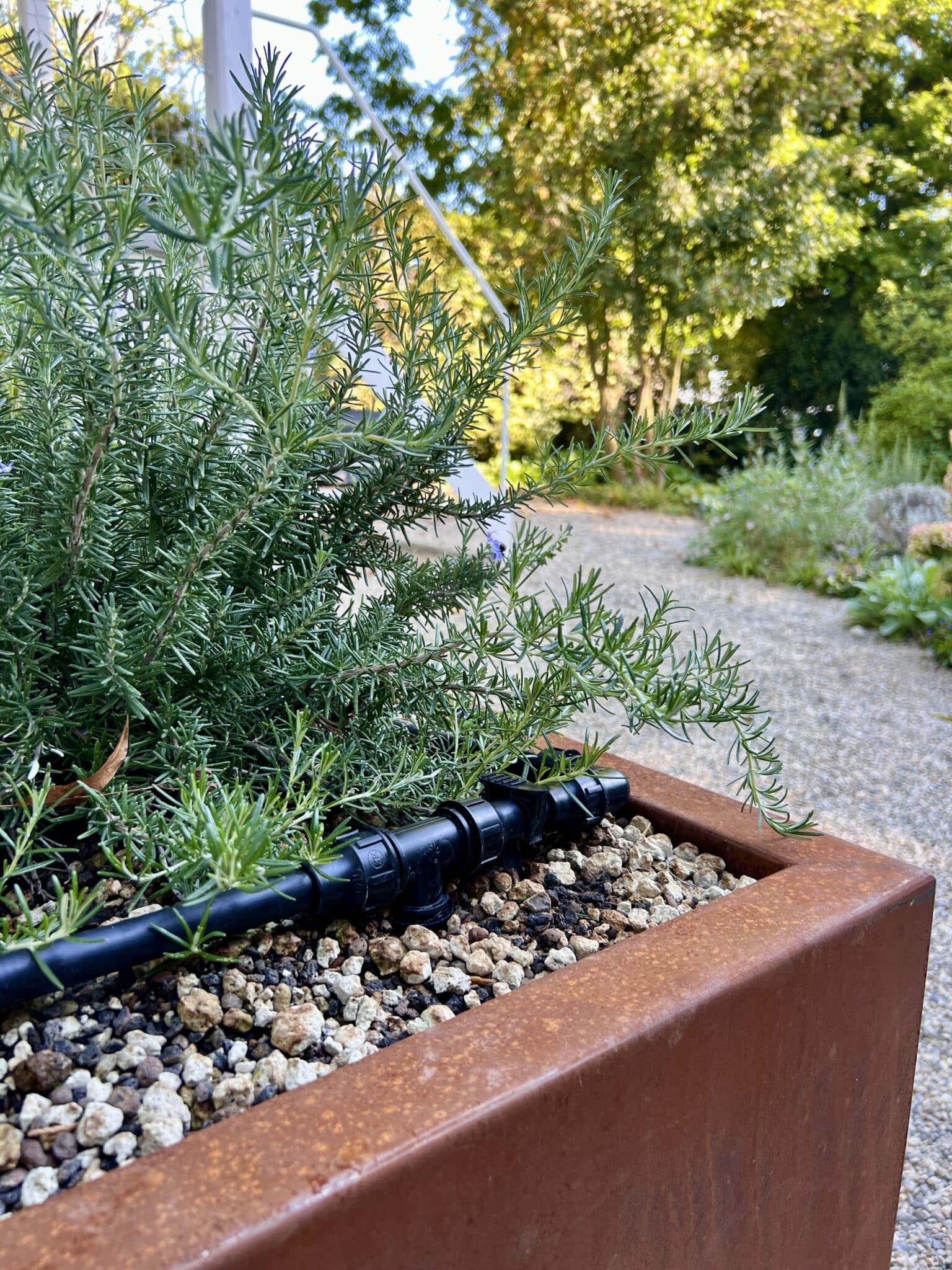 Une palette d’arbustes, vivaces, couvre-sols et grimpantes choisie avec soin complète la composition. Afin d’assurer le bon développement des végétaux, un système d’arrosage automatisé a également été installé.